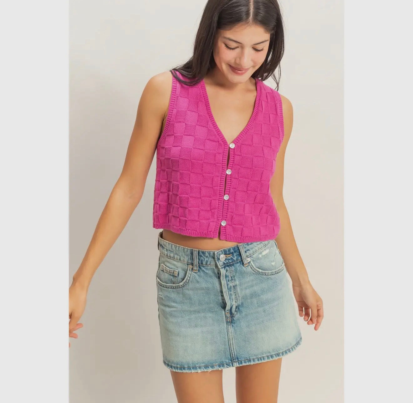 This stylish vest features an all-over basket weave checkerboard pattern that provides structure and visual interest. The design includes a ribbed V-neckline, a full front button placket, and tailored sleeveless armholes. Cut in a snug fitted silhouette at slightly cropped length, this piece pairs perfectly with high-waisted denim.